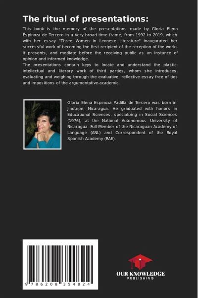 This book is the memory of the presentations made by Gloria Elena Espinoza de Tercero in a very broad time frame, from 1992 to 2019, which with her essay "Three Women in Leonese Literature" inaugurated her successful work of becoming the first recipient of the reception of the works it presents, and mediate before the receiving public as an instance of opinion and informed knowledge.The presentations contain keys to locate and understand the plastic, intellectual and literary work of third parties, whom she introduces, evaluating and weighing through the evaluative, reflective essay free of ties and impositions of the argumentative-academic.