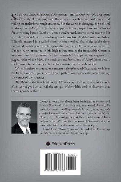 Several moons hang low over the islands of Aguaterre within the Great Volcanic Ring, where earthquakes, volcanoes and roiling sea make for a rough existence. But the world is changing, the political landscape is shifting, many dangers approach but people have secret hopes for something better. Garrison, beaten and berated, knows there's more to life than the chores of the farm and forge, and abuse from his blacksmithing father. Ellinvale, trapped in a walled estate within a walled city, chafes at the time-honoured tradition of matchmaking that limits her future as a woman. The Dragon King, protected in his high tower, studies the impassable Churn, a long swath of frothy ocean that likes to smash his ships to pieces against the jagged rocks of the Maw. He needs to send battalions of Amphibians across the Churn if he is to achieve his ambition-to reign over the world. When Garrison sets out alone on a special trip beyond Crossroads to deliver his father's wares, it puts them all on a path of convergence that could change the course of their futures. The Ritual is the first book in the Chronicles of Garrison series. At its core, it's a story of good versus evil, the strength of friendship and the discovery that there is power within.