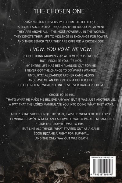 THE CHOSEN ONE Barrington University is home of the Lords, a secret society that requires their blood in payment. They are above all-the most powerful men in the world. They devote their lives to violence in exchange for power. And during their senior year, they are offered a chosen one. I VOW. YOU VOW. WE VOW. People think growing up with money is freeing, but I promise you, it's not. My entire life has been planned out for me. I never got the chance to do what I wanted until Ryat Alexander Archer came along and gave me an option for a better life. He offered me what no one else ever had-freedom. I chose to be his. He made me believe that anyway, but it was just another lie. A way that the Lords manipulate you into doing what they want. After being sucked into the dark, twisted world of the Lords, I embraced my new role and allowed Ryat to parade me around like the trophy I was to him. But like all things, what started out as a game soon became a fight for survival. And the only way out was death.