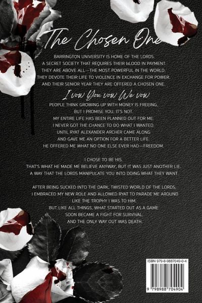THE CHOSEN ONE Barrington University is home of the Lords, a secret society that requires their blood in payment. They are above all-the most powerful men in the world. They devote their lives to violence in exchange for power. And during their senior year, they are offered a chosen one. I VOW. YOU VOW. WE VOW. People think growing up with money is freeing, but I promise you, it's not. My entire life has been planned out for me. I never got the chance to do what I wanted until Ryat Alexander Archer came along and gave me an option for a better life. He offered me what no one else ever had-freedom. I chose to be his. He made me believe that anyway, but it was just another lie. A way that the Lords manipulate you into doing what they want. After being sucked into the dark, twisted world of the Lords, I embraced my new role and allowed Ryat to parade me around like the trophy I was to him. But like all things, what started out as a game soon became a fight for survival. And the only way out was death.