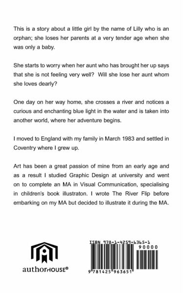 This is a story about a little girl by the name of Lilly who is an orphan; she loses her parents at a very tender age when she was only a baby. She starts to worry when her aunt who has brought her up says that she is not feeling very well? Will she lose her aunt whom she loves dearly? One day on her way home, she crosses a river and notices a curious and enchanting blue light in the water and is taken into another world, where her adventure begins.