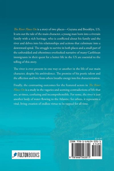 The River Flows On is a story of two places-Guyana and Brooklyn, US. It sets out the tale of the main character, a young man born into a riverain family with a rich heritage, who is conflicted about his family and the river and delves into his relationships and actions that culminate into a downward spiral. The struggle to survive in both places and a small part of the unheralded and oftentimes overlooked narrative of many Caribbean immigrants in their quest for a better life in the US are essential to the telling of this story. The river is ever present in one way or another in the life of our main character, despite his ambivalence. The promise of his poetic talent and the affection and love from others breathe energy into his characterization. Finally, the contrasting outcomes for the featured actors in The River Flows On is a study in the vagaries and seeming contradictions of life that are, at times, confusing and incomprehensible. For some, the river is just another body of water flowing to the Atlantic; for others, it represents a vital, living creation of endless virtue to be tapped for all time.