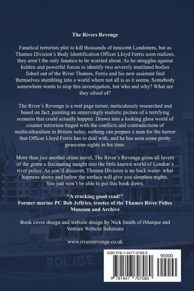 The River's Revenge Fanatical terrorists plot to kill thousands of innocent people, but as Thames Division's Body Identification Officer Lloyd Ferris soon realises, they aren't the only fanatics to be worried about. As he struggles against powerful hidden forces to identify two severely mutilated bodies fished out of the River Thames, Ferris and his new assistant find themselves stumbling into a world where not all is as it seems. Somebody somewhere wants to stop this investigation, but who and why? What are they afraid of? The River's Revenge is a real page turner, meticulously researched and based on fact, painting an unnervingly realistic picture of a terrifying scenario that is waiting to happen. As you will discover, Thames Division is no back water- what happens above and below the surface will give you sleepless nights. "A cracking good read!" Marine PC Bob Jeffries (ret) curator of the Thames Police Museum