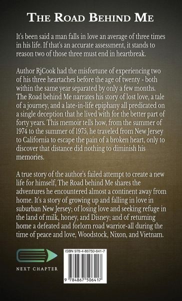 It's been said a man falls in love an average of three times in his life. If that's an accurate assessment, it stands to reason two of those three must end in heartbreak. Author RjCook had the misfortune of experiencing two of his three heartaches before the age of twenty - both within the same year separated by only a few months. The Road behind Me narrates his story of lost love, a tale of a journey, and a late-in-life epiphany all predicated on a single deception that he lived with for the better part of forty years. This memoir tells how, from the summer of 1974 to the summer of 1975, he traveled from New Jersey to California to escape the pain of a broken heart, only to discover that distance did nothing to diminish his memories. A true story of the author's failed attempt to create a new life for himself, The Road behind Me shares the adventures he encountered almost a continent away from home. It's a story of growing up and falling in love in suburban New Jersey; of losing love and seeking refuge in the land of milk, honey, and Disney; and of returning home a defeated and forlorn road warrior-all during the time of peace and love, Woodstock, Nixon, and Vietnam.