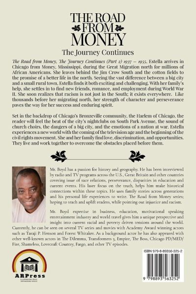 The Road from Money, the Journey Continues (Part 2) 1937 - 1955, Estella arrives in Chicago from Money, Mississippi, during the Great Migration north for millions of African Americans. She leaves behind the Jim Crow South and the cotton fields to the promise of a better life in the north. Seeing the vast difference between a big city and a small rural town, Estella finds it both exciting and challenging. With her family's help, she settles in to find new friends, romance, and employment during World War II. She soon realizes that racism is not just in the South; it exists everywhere. Like thousands before her migrating north, her strength of character and perseverance paves the way for her success and enduring spirit. Set in the backdrop of Chicago's Bronzeville community, the Harlem of Chicago, the reader will feel the beat of the city's nightclubs on South Park Avenue, the sound of church choirs, the dangers of a big city, and the emotions of a nation at war. Estella experiences a new world with the coming of the television age and the beginning of the civil rights movement. She and her family find love, discrimination, and opportunities. They live and work together to overcome the obstacles placed before them.