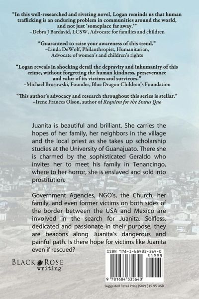 Juanita is beautiful and brilliant. She carries the hopes of her family, her neighbors in the village and the local priest as she takes up scholarship studies at the University of Guanajuato. There she is charmed by the sophisticated Geraldo who invites her to meet his family in Tenancingo, where to her horror, she is enslaved and sold into prostitution. Government Agencies, NGO’s, the Church, her family, and even former victims on both sides of the border between the USA and Mexico are involved in the search for Juanita. Selfless, dedicated and passionate in their purpose, they are beacons along Juanita’s dangerous and painful path. Is there hope for victims like Juanita even if rescued?