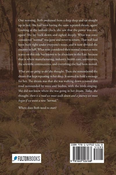 One morning, Beth awakened from a deep sleep and sat straight up in bed. She had been having the same repeated dream, again! Looking at the bedside clock, she saw that the power was out, again! She lay back down and sighed deeply. What was once considered "normal" was gone and never to return. That wall had been built right under everyone's noses, and it now divided the country in half. What were considered their normal resources were scarce on this side but known to be abundant in the East, because that is where manufacturing, industry, health care, universities, the scientific communities, and everything else had been moved. What are we going to do? she thought. Then she remembered the dream that kept repeating in her sleep. It seemed to hold a message for her. The dream was that she was walking down a rutted dirt road surrounded by trees and bushes, with the birds singing. She did not know where she was going in her dream. Today, she thought, there is a road we must walk down and a journey we must begin if we want a new "normal." Where does Beth need to start?