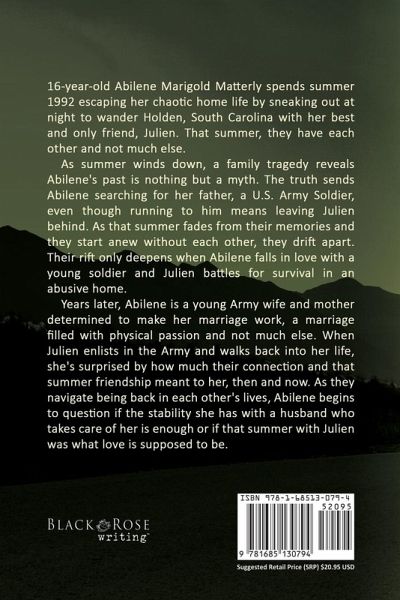 16-year-old Abilene Marigold Matterly spends summer 1992 escaping her chaotic home life by sneaking out at night to wander Holden, South Carolina with her best and only friend, Julien. That summer, they have each other and not much else. As summer winds down, a family tragedy reveals Abilene's past is nothing but a myth. The truth sends Abilene searching for her father, a U.S. Army Soldier, even though running to him means leaving Julien behind. As that summer fades from their memories and they start anew without each other, they drift apart. Their rift only deepens when Abilene falls in love with a young soldier and Julien battles for survival in an abusive home. Years later, Abilene is a young Army wife and mother determined to make her marriage work, a marriage filled with physical passion and not much else. When Julien enlists in the Army and walks back into her life, she's surprised by how much their connection and that summer friendship meant to her, then and now. As they navigate being back in each other's lives, Abilene begins to question if the stability she has with a husband who takes care of her is enough or if that summer with Julien was what love is supposed to be.