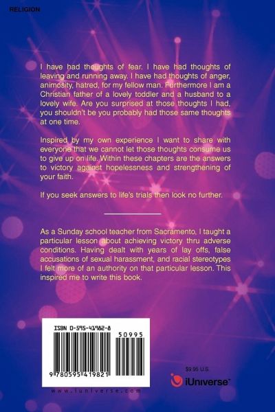 I have had thoughts of fear. I have had thoughts of leaving and running away. I have had thoughts of anger, animosity, hatred, for my fellow man. Furthermore I am a Christian father of a lovely toddler and a husband to a lovely wife. Are you surprised at those thoughts I had, you shouldn't be you probably had those same thoughts at one time. Inspired by my own experience I want to share with everyone that we cannot let those thoughts consume us to give up on life. Within these chapters are the answers to victory against hopelessness and strengthening of your faith. If you seek answers to life's trials then look no further.