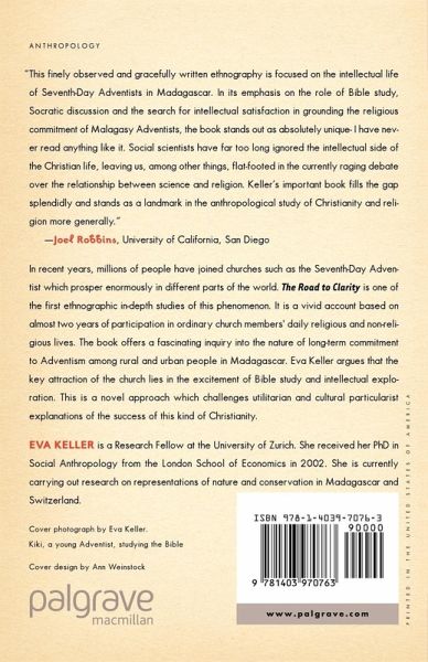 In recent years, millions of people have joined churches such as the Seventh-day Adventist which prosper enormously in different parts of the world. The Road to Clarity is one of the first ethnographic in-depth studies of this phenomenon. It is a vivid account based on almost two years of participation in ordinary church members' daily religious and non-religious lives. The book offers a fascinating inquiry into the nature of long-term commitment to Adventism among rural people in Madagascar. Eva Keller argues that the key attraction of the church lies in the excitement of study, argument and intellectual exploration. This is a novel approach which challenges utilitarian and cultural particularist explanations of the success of this kind of Christianity.