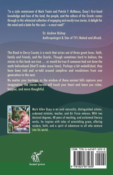 "In a style reminiscent of Mark Twain and Patrick F. McManus, Quay's first-hand knowledge and love of the land, the people, and the culture of the Ozarks comes through in this whimsical collection of engaging and mostly true stories. A delight for the mind and a balm for the soul-a must read!" Dr. Andrew Bishop Anthropologist & Star of TV's Naked and Afraid. The Road to Derry County is a work that arises out of three great loves: faith, family and friends, and the Ozarks. Though sometimes hard to believe, the stories in this book are true ... or would be true if someone had not done the math beforehand (that'll make sense later). Perhaps a bit embellished, they have been told and re-told around campfires and woodstoves from one generation to the next. No matter your heritage, as the wisdom of these ancient hills captures your imagination, the stories herein will touch your heart and leave you richer, happier, and more thoughtful. Mark Allen Quay is an avid naturalist, distinguished scholar, ordained minister, teacher, and Air Force veteran. With two doctoral degrees, 40 years of teaching, and acclaimed literary works, he inspires with tales of astonishing grace, offering wisdom, faith, and a spirit of adventure to all who venture into his world.