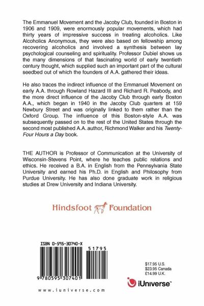 The Emmanuel Movement and the Jacoby Club, founded in Boston in 1906 and 1909, were enormously popular movements, which had thirty years of impressive success in treating alcoholics. Like Alcoholics Anonymous, they were also based on fellowship among recovering alcoholics and involved a synthesis between lay psychological counseling and spirituality. Professor Dubiel shows us the many dimensions of that fascinating world of early twentieth century thought, which supplied such an important part of the cultural seedbed out of which the founders of A.A. gathered their ideas. He also traces the indirect influence of the Emmanuel Movement on early A.A. through Rowland Hazard III and Richard R. Peabody, and the more direct influence of the Jacoby Club through early Boston A.A., which began in 1940 in the Jacoby Club quarters at 159 Newbury Street and was originally linked to them rather than the Oxford Group. The influence of this Boston-style A.A. was subsequently passed on to the rest of the United States through the second most published A.A. author, Richmond Walker and his Twenty-Four Hours a Day book.