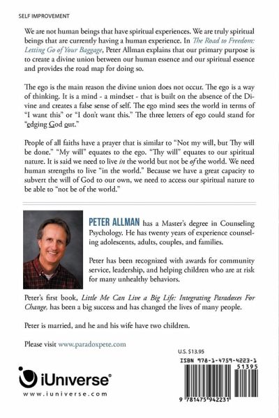We are not human beings that have spiritual experiences. We are truly spiritual beings that are currently having a human experience. In The Road to Freedom: Letting Go of Your Baggage, Peter Allman explains that our primary purpose is to create a divine union between our human essence and our spiritual essence and provides the road map for doing so. The ego is the main reason the divine union does not occur. The ego is a way of thinking. It is a mind - a mindset - that is built on the absence of the Divine and creates a false sense of self. The ego mind sees the world in terms of "I want this" or "I don't want this." The three letters of ego could stand for "edging God out." People of all faiths have a prayer that is similar to "Not my will, but Thy will be done." "My will" equates to the ego. "Thy will" equates to our spiritual nature. It is said we need to live in the world but not be of the world. We need human strengths to live "in the world." Because we have a great capacity to subvert the will of God to our own, we need to access our spiritual nature to be able to "not be of the world."