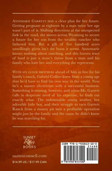 Annemarie Garrett had a clear plan for her future. Getting pregnant at eighteen by a man twice her age wasn't part of it. Neither was fighting to get her son's wealthy rancher father to provide for his child. Shifting directions at the unexpected fork in the road, she moves across Wyoming to secure a future for her son. But a gift of five hundred acres unwillingly given isn't the boon it seems. Annemarie knows nothing about ranching, and this barren tract of land is just a stone's throw from a man and his family who hate her and everything she represents. With six older brothers ahead of him in line for his family's ranch, Gabriel Collins knew from a young age that he'd have to find his own way in the world. Now he's a master electrician with a successful business. Something is missing, however, and when Annemarie calls in desperate need of his expertise, he finds out exactly what. The indomitable young mother, her adorable little boy, and their struggle to turn Garrett Ranch from a money pit into a profitable operation might just be the family and the cause he didn't know he was searching for... so long as the boy's father doesn't ruin everything.