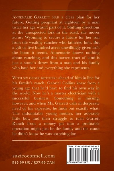 Annemarie Garrett had a clear plan for her future. Getting pregnant at eighteen by a man twice her age wasn't part of it. Neither was fighting to get her son's wealthy rancher father to provide for his child. Shifting directions at the unexpected fork in the road, she moves across Wyoming to secure a future for her son. But a gift of five hundred acres unwillingly given isn't the boon it seems. Annemarie knows nothing about ranching, and this barren tract of land is just a stone's throw from a man and his family who hate her and everything she represents. With six older brothers ahead of him in line for his family's ranch, Gabriel Collins knew from a young age that he'd have to find his own way in the world. Now he's a master electrician with a successful business. Something is missing, however, and when Annemarie calls in desperate need of his expertise, he finds out exactly what. The indomitable young mother, her adorable little boy, and their struggle to turn Garrett Ranch from a money pit into a profitable operation might just be the family and the cause he didn't know he was searching for... so long as the boy's father doesn't ruin everything.