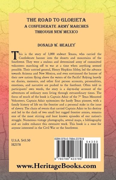 This is the story of 3,000 stalwart Texans, who carried the Confederate banner into the deserts and mountains of the Southwest. They were a zealous and determined army of committed volunteers marching off to war at a time when anything seemed possible. Their untried general, Henry Hopkins Sibley, led the advance towards Arizona and New Mexico, and even envisioned the banner of their new nation flying above the waters of the Pacific! Relying heavily on diaries, memoirs, and other first person accounts, personalities, emotions, and narrative are pushed to the forefront. Often told in participants' own words, the story is a day-to-day account of the adventures of ordinary men living through extraordinary times. The focus of much of the book is Captain Adair of the 7th Texas Mounted Volunteers. Captain Adair epitomizes the hardy Texas pioneer, with a family history of life on the frontier and a personal stake in the issue of slavery. The chain of events that carried Captain Adair to his destiny and led to the clash of two small but rugged frontier armies, remains one of the most stirring and least known episodes of our nation's struggle. Numerous vintage photographs, several maps, a bibliography and an index enhance this extensive work. This book is a MUST for anyone interested in the Civil War or the Southwest.
