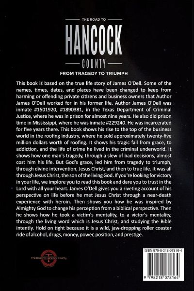 Meet the man who has had it all, lost it all, but found the truth in it all. If you are ready for a wild, jaw-dropping, mind-blowing rollercoaster of crime, drugs, and sex- prepare to meet James Odell-a millionaire who spent his fortune on alcohol, cocaine, women, and a lavish lifestyle. In his breathtaking, shocking, and mesmerizing autobiography, "The Road to Hancock County," James Odell tells about his life in organized crime and shows his long fall from power, position, and prestige. He shares how he became a heroin addict and an alcoholic. Finally, he ended up losing all the money that he made and everything that made life worthwhile, including his family. One day in the small town of Bay St. Louis, Mississippi, James was arrested and had a spiritual experience with God through Jesus Christ. He gave his life to the Lord. Miraculously, God opened the way for him to witness the goodness of God to thousands. He became a living witness of grace in the Hancock County Jail, in schools, treatment centers, and churches all over South Mississippi. James Odell did all of this while he was in prison. He would eventually become a college student at America's largest Christian university. You should hold on tight because James Odell gives you a riveting account of his former life and a beautiful testimony of God's grace. "The Road to Hancock County" has been verified on over 417 newspapers and news stations in North America. It has been featured on ABC, CBS, and NBC. It has been on Iheart radio, Tony Gribben's Show, and many more media outlets. The media had a field day with the press release.