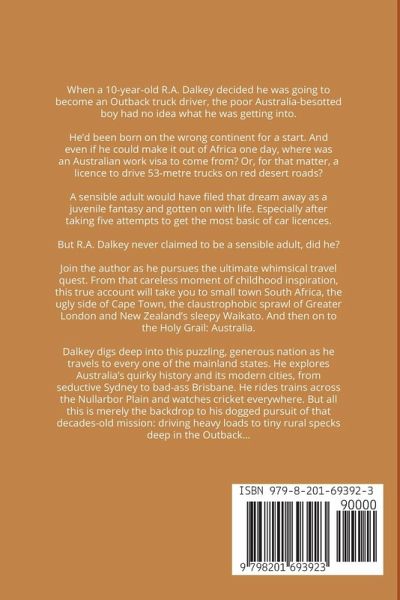 When a 10-year-old R.A. Dalkey decided he was going to become an Outback truck driver, the poor Australia-besotted boy had no idea what he was getting into. He'd been born on the wrong continent for a start. And even if he could make it out of Africa one day, where was an Australian work visa to come from? Or, for that matter, a licence to drive 53-metre trucks on red desert roads? A sensible adult would have filed that dream away as a juvenile fantasy and gotten on with life. Especially after taking five attempts to get the most basic of car licences. But R.A. Dalkey never claimed to be a sensible adult, did he? Join the author as he pursues the ultimate whimsical travel quest. From that careless moment of childhood inspiration, this true account will take you to small town South Africa, the ugly side of Cape Town, the claustrophobic sprawl of Greater London and New Zealand's sleepy Waikato. And then on to the Holy Grail: Australia. Dalkey digs deep into this puzzling, generous nation as he travels to every one of the mainland states. He explores Australia's quirky history and its modern cities, from seductive Sydney to bad-ass Brisbane. He rides trains across the Nullarbor Plain and watches cricket everywhere. But all this is merely the backdrop to his dogged pursuit of that decades-old mission: driving heavy loads to tiny rural specks deep in the Outback…