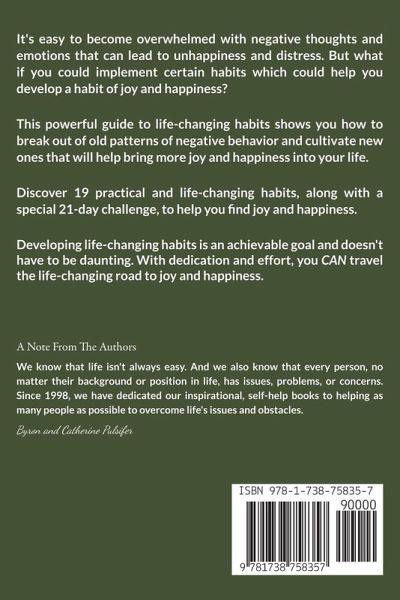 It's easy to become overwhelmed with negative thoughts and emotions that can lead to unhappiness and distress. But what if you could implement certain habits which could help you develop a habit of joy and happiness? Through this book, you will have a better understanding of how to find joy and happiness. This powerful guide to life-changing habits shows you how to break out of old patterns of negative behavior and cultivate new ones that will help bring more joy and happiness into your life every day. This book reveals 19 practical and life-changing habits, along with a special 21-day challenge, to help you find joy and happiness. Maybe you already have some of these habits, but maybe you don't, or you are missing other key habits. By cultivating certain habits (one, two, or more), you can open the door to a life of joy and happiness. It's like having a collection of maps for different places. No matter which map you look at, it will show you the same destination, but each map offers a unique route to get you there. The 19 key habits are like a map that can take you down this rewarding road, allowing you to uncover greater joy and happiness in all aspects of your life. Within its pages, the following key elements are discussed:Developing Resilience Embracing Spirituality Eliminating Negative Self-talk Overpowering Imposter Syndrome Setting Healthy Boundaries Success Surmounting Circumstances Hard Work Knowing Yourself Overcoming Worry Why Mindfulness The Truth About Money, Wealth Benefits of Ethics, Morals Banish Fear of Failure Using Time Wisely Not Blaming Others Age Doesn't Matter Incorporating Smiling, Laughter Beneficial Friendships Developing life-changing habits is an achievable goal and doesn't have to be daunting. There is no one path to joy and happiness, but a combination of elements. It may seem like an impossible task, but with dedication and effort, you CAN travel the life-changing road to joy and happiness. Don't wait. Start today!