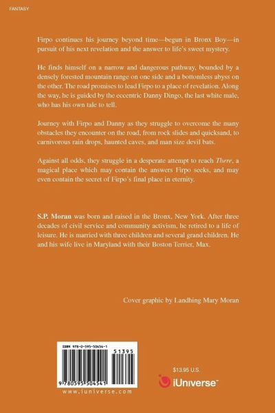 Firpo continues his journey beyond time-begun in Bronx Boy-in pursuit of his next revelation and the answer to life's sweet mystery. He finds himself on a narrow and dangerous pathway, bounded by a densely forested mountain range on one side and a bottomless abyss on the other. The road promises to lead Firpo to a place of revelation. Along the way, he is guided by the eccentric Danny Dingo, the last white male, who has his own tale to tell. Journey with Firpo and Danny as they struggle to overcome the many obstacles they encounter on the road, from rock slides and quicksand, to carnivorous rain drops, haunted caves, and man size devil bats. Against all odds, they struggle in a desperate attempt to reach There, a magical place which may contain the answers Firpo seeks, and may even contain the secret of Firpo's final place in eternity.