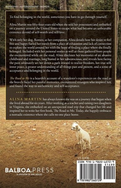 To find belonging in the world, sometimes you have to go through yourself. Alina Martin was fifty-four years old when she sold her possessions and embarked on a journey around the United States to escape what had become an unbearable existence devoid of self-worth and self-love. With only her dog, Romeo, as her companion, Alina details how her desire to feel free and happy fueled her travels from a place of exhaustion and lack of connection to explore the world around her with the hope of finding a place where she finally belonged. Included with her personal stories as well as those gathered from people she encountered while on the road, Alina discloses her memories of an abusive childhood and marriage, long buried in her subconscious, and reveals how facing the pain ultimately set her down a path inward to realize freedom, her true self, inner peace, a greater understanding of all things past and present, and a sense of acceptance and belonging in the world. The Road to Me is a heartfelt account of a wanderer's experiences on the road as she bravely faced her painful memories, encountered strangers who inspired her, and found the way to authenticity and self-acceptance.