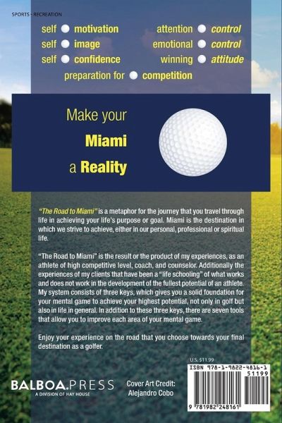 "The Road to Miami" is a metaphor for the journey that you travel through life in achieving your life's purpose or goal. Miami is the destination in which we strive to achieve, either in our personal, professional or spiritual life. "The Road to Miami" is the result or the product of my experiences, as an athlete of high competitive level, coach, and counselor. Additionally the experiences of my clients that have been a "life schooling" of what works and does not work in the development of the fullest potential of an athlete. My system consists of three keys, which gives you a solid foundation for your mental game to achieve your highest potential, not only in golf but also in life in general. In addition to these three keys, there are seven tools that allow you to improve each area of your mental game. Enjoy your experience on the road that you choose towards your final destination as a golfer.