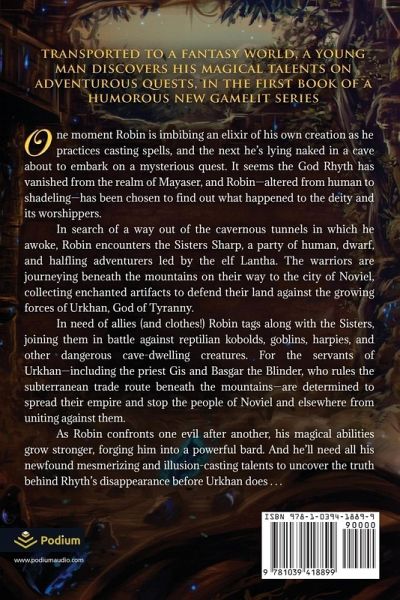 Transported to a fantasy world, a young man discovers his magical talents on adventurous quests, in the first book of a humorous new gamelit series. One moment Robin is imbibing an elixir of his own creation as he practices casting spells, and the next he's lying naked in a cave about to embark on a mysterious quest. It seems the God Rhyth has vanished from the realm of Mayaser, and Robin-altered from human to shadeling-has been chosen to find out what happened to the deity and its worshippers. In search of a way out of the cavernous tunnels in which he awoke, Robin encounters the Sisters Sharp, a party of human, dwarf, and halfling adventurers led by the elf Lantha. The warriors are journeying beneath the mountains on their way to the city of Noviel, collecting enchanted artifacts to defend their land against the growing forces of Urkhan, God of Tyranny. In need of allies (and clothes!) Robin tags along with the Sisters, joining them in battle against reptilian kobolds, goblins, harpies, and other dangerous cave-dwelling creatures. For the servants of Urkhan-including the priest Gis and Basgar the Blinder, who rules the subterranean trade route beneath the mountains-are determined to spread their empire and stop the people of Noviel and elsewhere from uniting against them. As Robin confronts one evil after another, his magical abilities grow stronger, forging him into a powerful bard. And he'll need all his newfound mesmerizing and illusion-casting talents to uncover the truth behind Rhyth's disappearance before Urkhan does . . . The first volume of the hit LitRPG adventure series-with more than 800,000 views on Royal Road-now available on Kindle, Kindle Unlimited, and Audible!