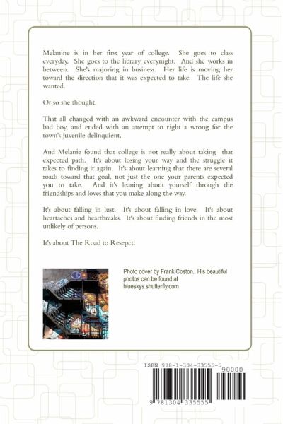 Melanie is in her first year of college. She goes to class every day. She goes to the library every night. And she works in between. She's majoring in business. Her life is moving her toward the direction that it was expected to take. The life she wanted. Or so she thought. That all changed with an awkward encounter with the campus bad boy, and ended with an attempt to right a wrong for the town's juvenile delinquent. And Melanie found that college is not really about taking that expected path. It's about losing your way and the struggle it takes to finding it again. It's about learning that there are several roads toward that goal, not just the one your parents expected you to take. And it's learning about yourself through the friendships and loves that you make along the way. It's about falling in lust. It's about falling in love. It's about heartaches and heartbreaks. It's about finding friends in the most unlikely of persons. It's about the road to respect.