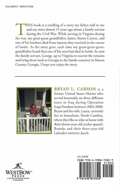 This book is a retelling of a story my father told to me and my sister almost 15 years ago about a family servant during the Civil War. While serving in Virginia during the war, my great-great-grandfather, James Alston Carson, and two of his brothers died from injuries they received in the course of battle. As the story goes, each time my great-great-great-grandfather heard that one of his sons had died in battle, he sent the family servant, George, up to Virginia to recover the remains and bring them back to Georgia to the family cemetery in Macon County, Georgia. I hope you enjoy the story.
