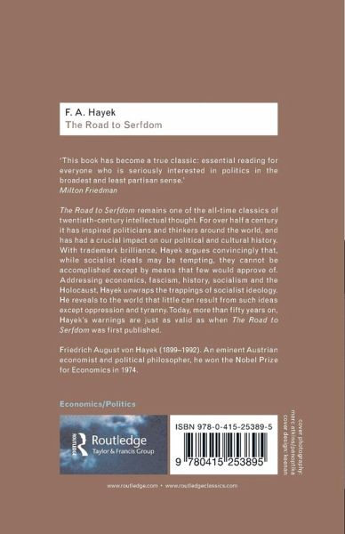 The Road to Serfdom remains one of the all-time classics of twentieth-century intellectual thought. For over half a century, it has inspired politicians and thinkers around the world, and has had a crucial impact on our political and cultural history. With trademark brilliance, Hayek argues convincingly that, while socialist ideals may be tempting, they cannot be accomplished except by means that few would approve of. Addressing economics, fascism, history, socialism and the Holocaust, Hayek unwraps the trappings of socialist ideology. He reveals to the world that little can result from such ideas except oppression and tyranny. Today, more than fifty years on, Hayek's warnings are just as valid as when The Road to Serfdom was first published.
