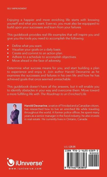 Enjoying a happier and more enriching life starts with knowing yourself and what you want. Even so, you must also be equipped to build upon your successes and learn from your failures. This guidebook provides real-life examples that will inspire you and give you the tools you need to accomplish the following: ¿ Define what you want. ¿ Visualize your goals on a daily basis. ¿ Create and commit to an action plan. ¿ Adhere to a schedule to accomplish objectives. ¿ Move ahead in the face of adversity. Determine what success means for you, and start building a plan to experience and enjoy it. Join author Harold Deonarine as he examines the successes and failures in his own life and how he has achieved goals that once seemed unreachable. This guidebook doesn't have all the answers, but it will enable you to identify obstacles in your way and overcome them. Move toward a more fulfilling life with The Roadmap to an Enriched Life.