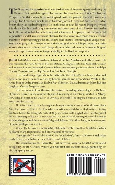 The Road to Prosperity book was birthed out of discovering and exploring the Palmetto Trail, which is right off his property between Pomaria, South Carolina, and Prosperity, South Carolina. It has nothing to do with the pursuit of wealth, power, nor prestige, but it has everything to do with allowing oneself to connect with God’s creative beauty along the road to Prosperity. It’s on the road or near the road to Prosperity where friends and family shared unique moments and ideas-many of which are written in this book. He lives alone but shares the beauty and uniqueness of his property with schools, civil organizations, and at-risk youths and children. The boot camp, man-made beach, extensive fruit trees, and composting garden are just few of his creative ideas through his unique small farm upbringing, military experience, and schooling, all of which helped equip him with a desire to function in a diverse and change climates. Many adventures, heart-touching and romantic experiences, creative imagery highlights The Road to Prosperity.