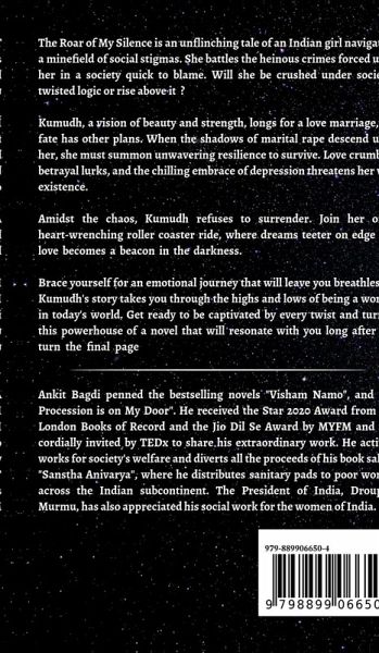 The Roar of My Silence is an unflinching tale of an Indian girl navigating a minefield of social stigmas. She battles the heinous crimes forced upon her in a society quick to blame. Will she be crushed under society's twisted logic or rise above it? Kumudh, a vision of beauty and strength, longs for a love marriage, but fate has other plans. When the shadows of marital rape descend upon her, she must summon unwavering resilience to survive. Love crumbles, betrayal lurks, and the chilling embrace of depression threatens her very existence. Amidst the chaos, Kumudh refuses to surrender. Join her on a heart-wrenching roller coaster ride, where dreams teeter on edge and love becomes a beacon in the darkness. Brace yourself for an emotional journey that will leave you breathless as Kumudh's story takes you through the highs and lows of being a woman in today's world. Get ready to be captivated by every twist and turn in this powerhouse of a novel that will resonate with you long after you turn the final page.
