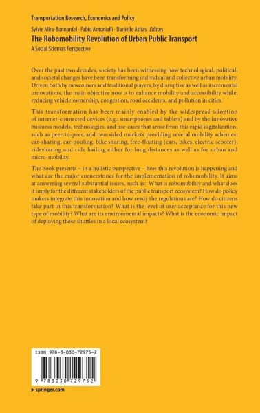 Introduction.- Part I: Robomobility implementation into public transport networks.- Chapter 1: Autonomous on-demand vehicles and the (r)evolution of public transport business models.- Chapter 2: Evolution of Government Policy for Autonomous Mobility: Korean and French cases and their differences.- Chapter 3: How to assess Regulation Openness for Autonomous Driving in public transport? The ROAD Index.- Chapter 4: Economic Assessment of Services with Intelligent Autonomous Vehicles: EASI-AV.- Chapter 5: From demonstrator to public service: the AVENUE experience.- Part II: Integrating robomobility in the larger perspective of urban mobility innovation embedded in societal contexts.- Chapter 6: Recommendations for a user-centered design of mobility solutions.- Chapter 7: The integration of innovative mobility into the urban transport network: A literature review.- Chapter 8: Public transport in emerging countries: from old dilemmas to opportunities for transition to sustainable mobility through the case of Brazil.- Chapter 9: MaaS as a catalyst for the Public Transport Revolution in Developing Countries.- Chapter 10: Reflexions on urban mobility governance: moving towards tomorrow's robomobility.- Conclusion.- Index.