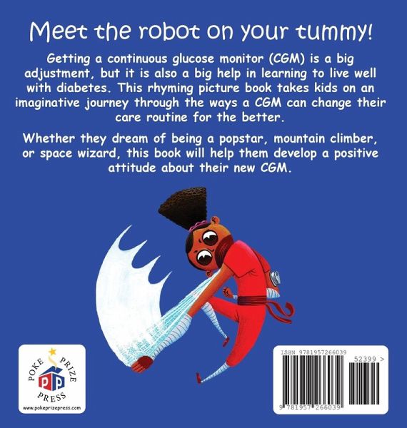 Meet the robot on your tummy! Getting a continuous glucose monitor (CGM) is a big adjustment, but it is also a big help in learning to monitor blood sugar and live well with diabetes. Featuring fun rhymes, hand-painted illustrations, and colorful scenarios, The Robot on My Tummy takes children on an imaginative journey through the ways a CGM can change their care routine for the better. Helpful backmatter explains how CGMs can assist kids and caregivers in anticipating and managing the highs and lows of diabetes. Whether kids dream of being a popstar, mountain climber, or space wizard, this book will help them develop a positive attitude about their new CGM companion, the robot on their tummy!