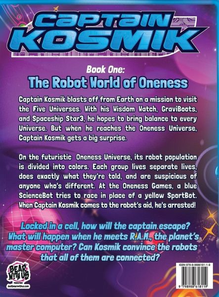 Teaching children core values of Self-love, Gratitude, forgiveness, resilience, empowerment, and confidence. Great Christmas gift. Book 1: Captain Kosmik blasts off from Earth on a mission to visit the Five Universes. With his Wisdom Watch, GraviBoots, and Spaceship Star3, he hopes to bring balance to every universe. But when he reaches the Oneness Universe, Captain Kosmik gets a big surprise.On the futuristic Oneness Universe, its robot population is divided into colors. Each group lives separate lives, does exactly what they're told, and are suspicious of anyone who's different. At the Oneness Games, a blue ScienceBot tries to race in place of a yellow SportBot. When Captain Kosmik comes to the robot's aid, he's arrested! Locked in a cell, how will the captain escape? What will happen when he meets R.A.M., the planet's master computer? Can Kosmik convince the robots that all of them are connected?