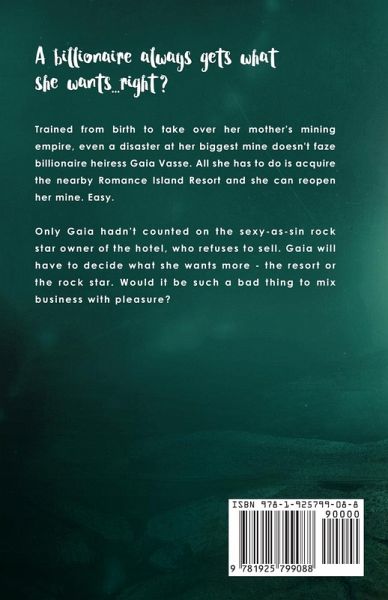 A billionaire always gets what she wants...right? Trained from birth to take over her mother's mining empire, even a disaster at her biggest mine doesn't faze billionaire heiress Gaia Vasse. All she has to do is acquire the nearby Romance Island Resort and she can reopen her mine. Easy. Only Gaia hadn't counted on the sexy-as-sin rock star owner of the hotel, who refuses to sell. Gaia will have to decide what she wants more - the resort or the rock star. Would it be such a bad thing to mix business with pleasure?