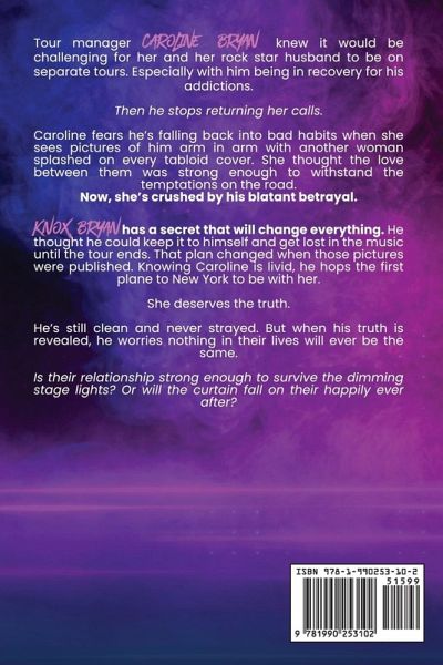 Tour manager Caroline Bryan knew it would be challenging for her and her rock star husband to be on separate tours. Especially with him being in recovery for his addictions. Then he stops returning her calls. Caroline fears he's falling back into bad habits when she sees pictures of him arm in arm with another woman splashed on every tabloid cover. She thought the love between them was strong enough to withstand the temptations on the road. Now, she's crushed by his blatant betrayal. Knox Bryan has a secret that will change everything. He thought he could keep it to himself and get lost in the music until the tour ends. That plan changed when those pictures were published. Knowing Caroline is livid, he hops the first plane to New York to be with her. She deserves the truth. He's still clean and never strayed. But when his truth is revealed, he worries nothing in their lives will ever be the same. Is their relationship strong enough to survive the dimming stage lights? Or will the curtain fall on their happily ever after?