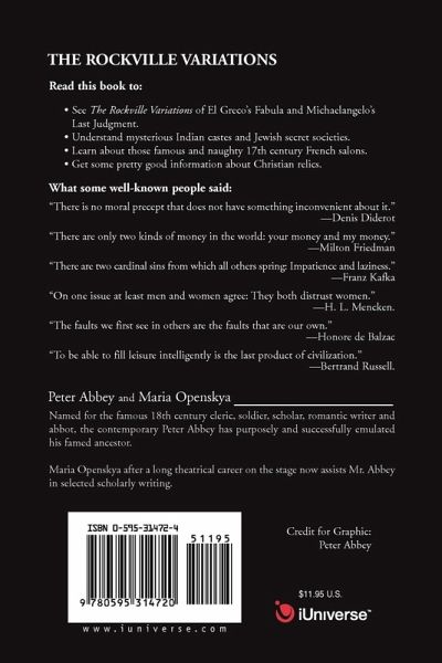 Read this book to: See The Rockville Variations of El Greco's Fabula and Michaelangelo's Last Judgment. Understand mysterious Indian castes and Jewish secret societies. Learn about those famous and naughty 17th century French salons. Get some pretty good information about Christian relics. What some well-known people said: "There is no moral precept that does not have something inconvenient about it." --Denis Diderot "There are only two kinds of money in the world: your money and my money." --Milton Friedman "There are two cardinal sins from which all others spring: Impatience and laziness." --Franz Kafka "On one issue at least men and women agree: They both distrust women." --H. L. Mencken. "The faults we first see in others are the faults that are our own." --Honore de Balzac "To be able to fill leisure intelligently is the last product of civilization." --Bertrand Russell.