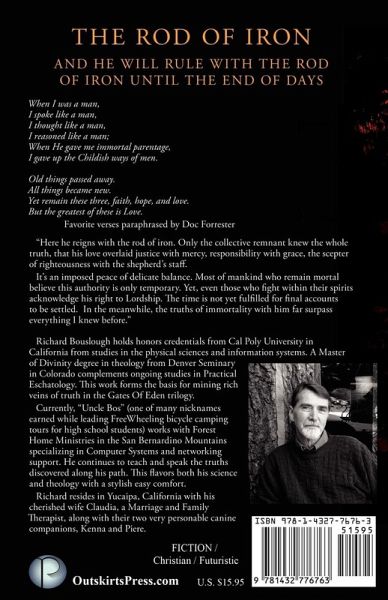 IMMORTAL PARENTAGE When I was a man, I spoke like a man, I thought like a man, I reasoned like a man; When He gave me immortal parentage, I gave up the childish ways of men. Old things passed away. All things became new. Yet remain these three, faith, hope, and love. But the greatest of these is Love, For God is Love. Here Jesus reigns with the rod of iron. Only the collective remnant knew the whole truth, that his love overlaid justice with mercy, responsibility with grace, that he wielded the scepter of righteousness along with a shepherd's staff. And he has given us everlasting Life. It's an imposed peace of delicate balance. Most of mankind who remain mortal believe this authority is only temporary. Yet, even those who fight in their spirits acknowledge his right to Lordship and the global throne. The time is not yet fulfilled for final accounts to be settled. In the meanwhile, the truths of immortality with him far surpass everything I knew before. So ends Gates of Eden, the first of Richard Bouslough's challenging yet hope building trilogy. Now with the Rod of Iron, Bouslough surprises his readers with truths from the highly anticipated Millennium, the 1000 year reign of the King of kings and Lord of lords from the throne room in Jerusalem. Covering masterfully the return of Messiah and the revealing of the Ark of the Covenant, Bouslough goes on to propose scientific and technical advancements made possible only through international cooperation and mentoring by gifted Immortals in service to the King. Every few years an exciting book or series of books comes along that expands our vision of our world and its future. These books do just that and then some. You will think differently about heaven and hell, the new heaven and new earth, perhaps even meet the Messiah himself, and be awestruck by the bright future of technological progress having read this latest offering, The Rod of Iron, from Richard Douglas Bouslough.