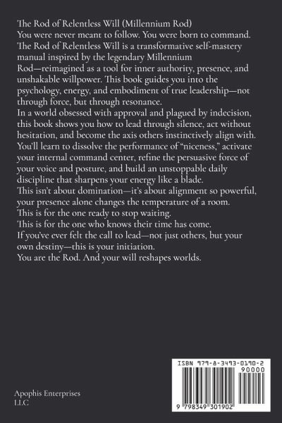 The Rod of Relentless Will (Millennium Rod) You were never meant to follow. You were born to command. The Rod of Relentless Will is a transformative self-mastery manual inspired by the legendary Millennium Rod-reimagined as a tool for inner authority, presence, and unshakable willpower. This book guides you into the psychology, energy, and embodiment of true leadership-not through force, but through resonance. In a world obsessed with approval and plagued by indecision, this book shows you how to lead through silence, act without hesitation, and become the axis others instinctively align with. You'll learn to dissolve the performance of "niceness," activate your internal command center, refine the persuasive force of your voice and posture, and build an unstoppable daily discipline that sharpens your energy like a blade. This isn't about domination-it's about alignment so powerful, your presence alone changes the temperature of a room. This is for the one ready to stop waiting. This is for the one who knows their time has come. If you've ever felt the call to lead-not just others, but your own destiny-this is your initiation. You are the Rod. And your will reshapes worlds.