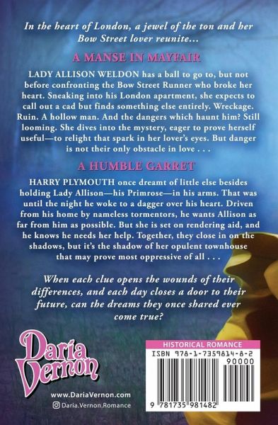 In the heart of London, a jewel of the ton and her Bow Street lover reunite... A MANSE IN MAYFAIR LADY ALLISON WELDON has a ball to go to, but not before confronting the Bow Street Runner who broke her heart. Sneaking into his London apartment, she expects to call out a cad but finds something else entirely. Wreckage. Ruin. A hollow man. And the dangers which haunt him? Still looming. She dives into the mystery, eager to prove herself useful-to relight that spark in her lover's eyes. But danger is not their only obstacle in love... A HUMBLE GARRET HARRY PLYMOUTH once dreamt of little else besides holding Lady Allison-his Primrose-in his arms. That was until the night he woke to a dagger over his heart. Driven from his home by nameless tormentors, he wants Allison as far from him as possible. But she is set on rendering aid, and he knows he needs her help. Together, they close in on the shadows, but it's the shadow of her opulent townhouse that may prove most oppressive of all... When each clue opens the wounds of their differences, and each day closes a door to their future, can the dreams they once shared ever come true?