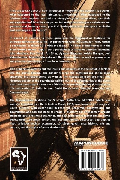 If we are to talk about a 'new' intellectual movement, the question is begged: what happened to the 'old' intellectual movement? What happened to the thinkers who inspired and led our struggle against colonialism, apartheid and exploitation? What has happened to the thinkers who gave substance and guidance and, in many cases, practical leadership to our attempts to undo the past and forge a new future? In pursuit of answers to these questions, the Mapungubwe Institute for Strategic Reflection (MISTRA), in partnership with the Liliesleaf Trust, hosted a roundtable in March 2015 with the theme 'The Role of Intellectuals in the State-Society Nexus'. Inputs were provided by a range of thinkers, including Ibbo Mandaza, Ben Turok, Ari Sitas, Ayanda Ntsaluba, Xolela Mangcu, Joel Netshitenzhe, Tshilidzi Marwala and Nomboniso Gasa, as well as provocative and piercing contributions from the attendees. This publication aims to put the inputs and debates at the roundtable further into the public domain, and simply records the contributions of the main speakers, the respondents, as well as the discussion from the floor. The rigorous debate at the roundtable spilled out of the boundaries of the event itself and encouraged a number of thinkers to provide additional material for this publication: Z. Pallo Jordan, David Moore (with Tshilidzi Marwala) and Desiree Lewis.