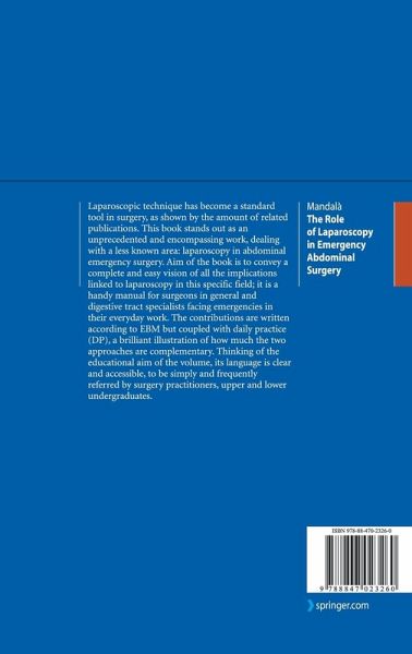 This is the first time a book about laparoscopy in emergency abdominal surgery has been published. Numerous articles have been published in specific surgical journals, but, until now, there has not been a book that collates all the aspects of this little-known field. The aim of this volume is to achieve a complete and easy presentation of all the implications associated with laparoscopy in emergency abdominal surgery. The book should be a manual that can be easily consulted by digestive, general, and specialized surgeons, especially in an emergency. The authors' contributions are founded on evidence-based medicine, which give the book scientific credibility, but this is coupled with their experience of daily practice, which adds an important complementary dimension to evidence-based medicine. This is balanced by an emphasis on clarity and accessibility, because the ultimate aim of the book is educational. We hope this book will be frequently consulted, in depth, not only by specialistpractitioners, but also by undergraduate students, new graduates and surgeons in training.