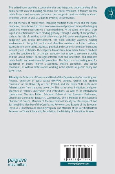 Chapter 1. Introduction: Navigating the Landscape of Social and Economic Resilience.- Chapter 2. The Detrimental Impact of Political Budget Cycles on the Greek Economy.- Chapter 3. Cash flow statements for General Government of Greece from 2025: Answers to long-term queries.- Chapter 4. Reducing Public Funds Reliance in Olympic Bids: The Agenda 2020 Approach.- Chapter 5. The role of public sector wage rates in the determination of labour share.- Chapter 6. Building resilience in the public sector through risk assessment, activity based budgeting and performance audit.- Chapter 7. Public Budgeting: an amoeba of public policies.- Chapter 8. Greening Human Capital: A Catalyst for Organizational and Environmental Resilience.- Chapter 9. Enhancing Social and Economic Resilience for a Changing World: The Strategic Role of Continuous Training and Capacity Building in Contemporary Tax and Customs Administrations.- Chapter 10. Development of state infrastructure with the involvement of the private sector.- Chapter 11. A methodology for improving the resilience of the public sector through job satisfaction.- Chapter 12. Fortifying Economic Foundations: Cybersecurity Imperatives for a Resilient Financial System.- Chapter 13. Innovation districts as a model of sustainable urban economic development.- Chapter 14. The Implementation of Strategic Planning in Public Organizations in Greece: The case of e-EFKA.- Chapter 15. Impact of cost accounting models on estimations in adult Intensive Care Units (ICUs) and on reimbursement system: A case study of a public hospital during the covid-19 pandemic.