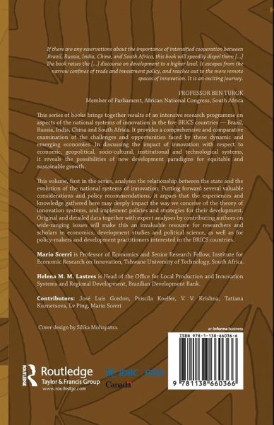 This series of books brings together results of an intensive research programme on aspects of the national systems of innovation in the five BRICS countries - Brazil, Russia, India, China and South Africa. It provides a comprehensive and comparative examination of the challenges and opportunities faced by these dynamic and emerging economies. In discussing the impact of innovation with respect to economic, geopolitical, socio-cultural, institutional and technological systems, it reveals the possibilities of new development paradigms for equitable and sustainable growth. This volume, first in the series, analyses the relationship between the state and the evolution of the national systems of innovation. Putting forward several valuable considerations and policy recommendations, it argues that the experiences and knowledge gathered here may deeply impact the way we conceive of the theory of innovation systems, and implement policies and strategies for their development. Original and detailed data together with expert analyses by contributing authors on wide-ranging issues will make this an invaluable resource for researchers and scholars in economics, development studies and political science, as well as for policy-makers and development practitioners interested in the BRICS countries.