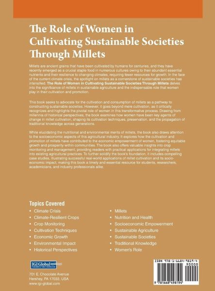 Millets are ancient grains that have been cultivated by humans for centuries, and they have recently emerged as a crucial staple food in numerous cultures owing to their abundant essential nutrients and their resilience to changing climates, requiring fewer resources for growth. In the face of the current climate crisis, the spotlight on millets as a cornerstone of sustainable societies has intensified. The Role of Women in Cultivating Sustainable Societies Through Millets delves into the significance of millets in sustainable agriculture and the indispensable role that women play in their cultivation and promotion. This book seeks to advocate for the cultivation and consumption of millets as a pathway to constructing sustainable societies. However, it goes beyond mere cultivation, as it critically recognizes and highlights the pivotal role of women in this transformative process. Drawing from millennia of historical perspectives, the book examines how women have been key agents of change in millet cultivation, shaping its cultivation techniques, preservation, and the propagation of traditional knowledge across generations. To further solidify the book's foundation, it includes compelling case studies, illustrating successful real-world applications of millet cultivation and its socio-economic impact, making this book a timely and essential resource for students, researchers, academicians, and industry professionals alike.
