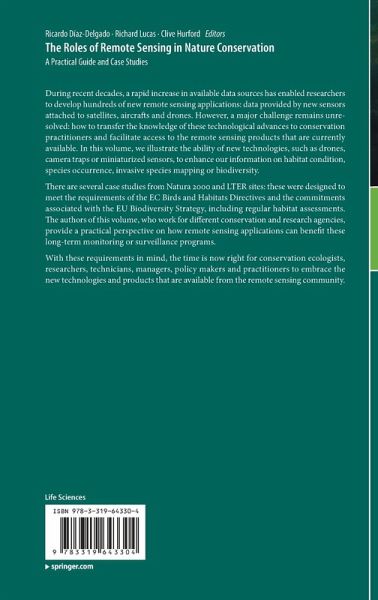 1. Introducing the Book "The Roles of Remote Sensing in Nature Conservation".- 2. Towards a Mature Age of Remote Sensing for Natura 2000 Habitat Conservation: Poor method transferability as a prime obstacle.- 3. Pre-processing of Remotely Sensed Imagery.- 4. Long-term Ecological Monitoring at Landscape Scale for Nature Conservation: The example of Doñana protected area.5. NILS - A Nationwide Inventory Program for Monitoring the Conditions and Changes of the Swedish Landscape.- 6. Mapping Coastal Habitats in Wales.- 7. Integrated Monitoring for Biodiversity Using Remote Sensing: From local to regional.- 8. Sub-pixel Mapping of Doñana Shrubland Species.9. Mapping the Distribution of Understorey Rhododendron ponticum Using Low-tech Multispectral UAV Derived Imagery.- 10. The Potential of UAV Derived Image Features for Discriminating Savannah Tree Species.- 11. A Toolbox for Remotely Monitoring Large Carnivores in Sweden.- 12. Coupling Field Sampling with Earth Observation Increases Understanding of Tiger Movement and Behaviour.- 13. Improving the Accuracy of Bird Counts Using Manual and Automated Counts in ImageJ: An Open-Source Image Processing Program.- 14. Using UAVs to Map Aquatic Bird Colonies.- 15. The Integrated Land Cover and Change Classifications.- 16. Expected Advances In a Rapidly Developing Work Area.