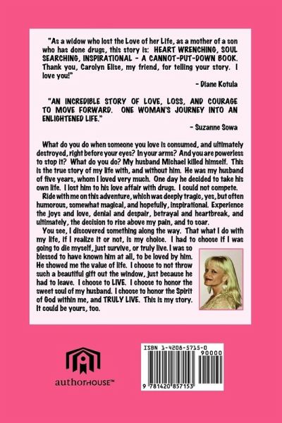 My husband Michael killed himself. This is the true story of my life with, and without him. He was my husband of five years, whom I loved very much. One day he decided to take his own life. I lost him to his love affair with drugs. I could not compete. What do you do when someone you love is consumed, and ultimately destroyed, right before your eyes? In your arms? And you are powerless to stop it? What do you do? Ride with me on this adventure, which was deeply tragic, yes, but often humorous, somewhat magical, and hopefully, inspirational. Experience the joys and love, denial and despair, betrayal and heartbreak, and ultimately, the decision to rise above my pain, and to soar. You see, I discovered something along the way. That what I do with my life, if I realize it or not, is my choice. I had to choose if I was going to die myself, just survive, or truly live. I was so blessed to have known him at all, to be loved by him. He showed me the value of life. I choose to not throw such a beautiful gift out the window, just because he had to leave. I choose to LIVE. I choose to honor the sweet soul of my husband. I choose to honor the Spirit of God within me, and TRULY LIVE. This is my story. It could be yours, too. "As a widow who lost the Love of her Life, as a mother of a son who has done drugs, this story is: HEART WRENCHING, SOUL SEARCHING, INSPIRATIONAL - A CANNOT-PUT-DOWN BOOK. Thank you, Carolyn Elise, my friend, for telling your story. I love you!" - Diane Kotula "AN INCREDIBLE STORY OF LOVE, LOSS, AND COURAGE TO MOVE FORWARD. ONE WOMAN'S JOURNEY INTO AN ENLIGHTENED LIFE." - Suzanne Sowa