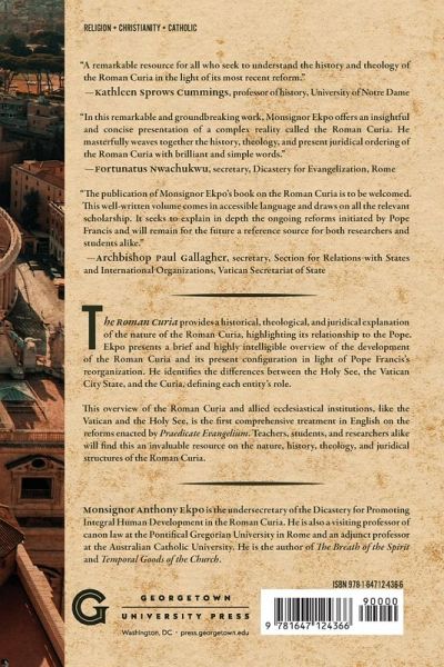 A historical, theological and juridical explanation of the nature of the Roman Curia The Roman Curia is the central body for the administration of the Roman Catholic Church. Its structure and organization is governed by Praedicate Evangelium, a new law issued by Pope Francis in 2022. The nature of the Curia is both confusing to many and vitally important for the administration of the Church and the Vatican. The Roman Curia provides a historical, theological, and juridical explanation of the nature of the Roman Curia, highlighting its relationship to the Pope. Ekpo provides a brief and highly intelligible overview of the development of the Roman Curia and its present configuration in the light of Pope Francis' reorganization. He shows the differences between the Holy See, Vatican City State and the Curia, defining each entity's role. This overview of the Roman Curia and allied ecclesiastical institutions, like the Vatican and the Holy See, is the first comprehensive treatment in English on the reforms enacted by Praedicate Evangelium. Teachers, students, and researchers alike will find this an invaluable on the nature, history, theology, and juridical structures of the Roman Curia.